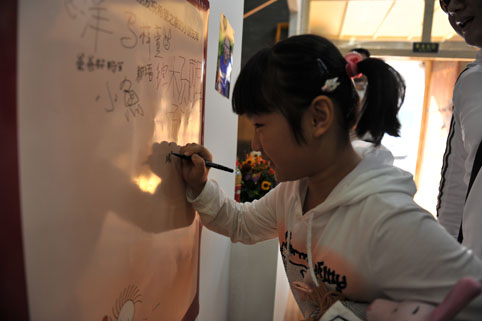小朋友陸續入場,在簽名板上寫下自己的名字,簽名海報及禮物送給希望之家的小朋友。