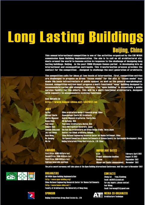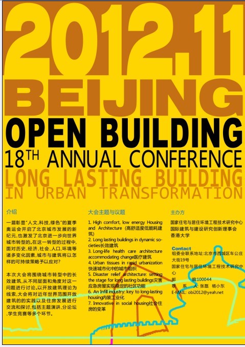 開放建筑年會是國際建筑與建設研究創新理事會(CIB)每年就全世界范圍內交流開放建筑研究成果的重要活動,第18屆國際開放建筑大會將于2012年11月在北京召開,這也是中國第一次主辦該項國際會議。本次國際會議將由國際建筑與建設研究創新理事會、國家住宅與居住環境工程技術研究中心、香港大學聯合主辦,論壇將包括主題演講、論文發言、國際設計競賽等多個環節。