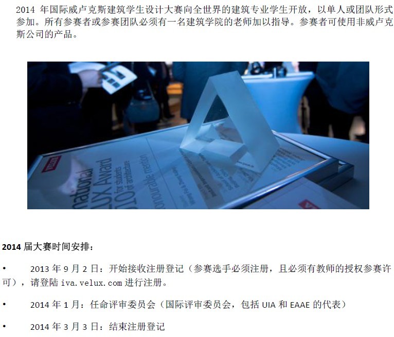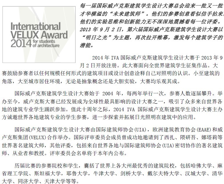 了解大賽更多信息詳見 iva.velux.com www.facebook.com/InternationalVELUXaward 、 http://velux.com.cn/contest.asp