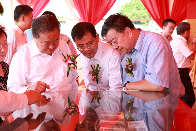 圖:國務院參事、中國可再生能源學會理事長石定寰,臺達集團創辦人鄭崇華,國家住宅與居住環境工程技術研究中心主任仲繼壽觀看中達低碳示范住宅項目模型