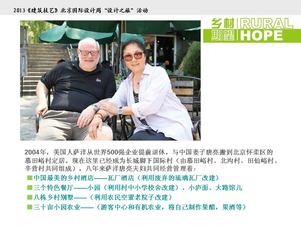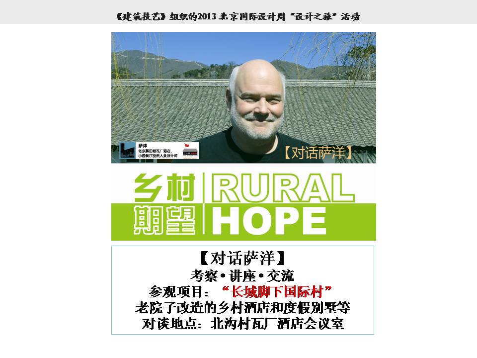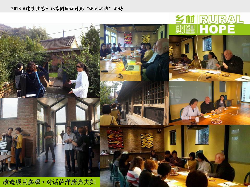 2013年9月27日《建筑技藝》組織了“鄉村期望 對話薩洋”活動,由來自中國建筑設計集團城鎮規劃設計研究院文化古鎮保護所、一合建筑工作室、國家住宅工程中心太陽能所的建筑師們和洛可可創意農業一行人前往北京懷柔慕田峪長城腳下最美的鄉村,參觀了薩洋唐亮夫婦改建并經營的充滿藝術氣息的小園餐廳和瓦廠酒店,以及租賃農民空置老院子改造的三個鄉村度假別墅。