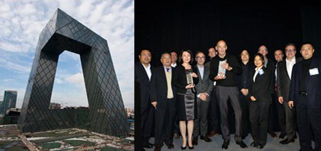 世界高層建筑學會(CTBUH)"2013年度高層建筑獎"評選11月7日晚在美國芝加哥揭曉,中央電視臺新址大樓成為最大贏家,獲得唯一的最高獎“全球最佳高層建筑獎”。主創建筑師庫哈斯(中間手捧獎杯者)、中方合作設計單位代表華東建筑設計研究院顧問總工程師汪大綏(左二)及承建方中建總公司等代表共同領獎。