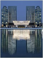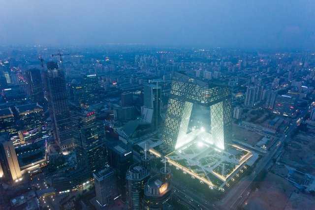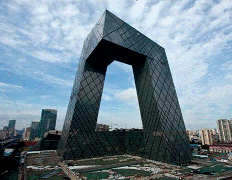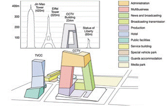 央視大樓位于北京的CBD區域,建筑面積470000m2OMA的設計成功地把所有功能安置在一座建筑內——一個把各項活動互相連接在一起的循環。234m高的大樓外形像是一個三維連續彎折的循環,內部包含整個電視制作過程所需的新聞、廣播、演播室、行政辦公區及公共區域。大樓的兩棟塔樓以10?傾斜、13層樓高的懸臂在162m的高空處連接,底部則是10層樓的裙房與3層地下室。公共設施包含一個劇院、酒店及電視文化中心(TVCC),整個建筑群通過一個專門的服務樓提供全部樓宇設備服務。整個項目在包含外部功能媒體園的187000m2場地上進行開發,總建筑面積599000m2。