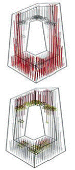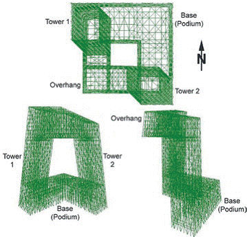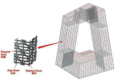 筒體的初始設計是以柱、周邊圈梁和斜撐有規律地組成兩層樓高的典型模塊化組件。之所以選擇這種方案,是為了適應塔樓內若干處于二層高的演播室。然而初步分析結果顯示,大樓斜撐的受力在結構的不同位置變化相當大,特別是集中于懸臂的根部以及與基座連接的部分。因此在優化過程中,根據設計所需的強度和剛度,以地震分析為準,通過增加或減少斜撐而變化(如翻倍或減半布置斜撐)。該過程中始終與建筑師保持著緊密的合作,因為斜撐的布置決定著外立面是否美觀。優化工作亦在一定程度上使斜撐構件截面尺寸標準化。