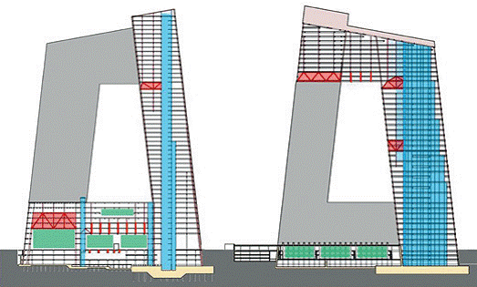 施工期間,斜撐筒體結構為傾斜的塔樓提供足夠的剛度,使兩塔樓在連接并相互支撐前都能在嚴格的允許誤差范圍內安全地施工。此結構亦適合懸臂部分的建造,容許兩個半截的懸臂部分在連接前分別臨時懸挑于兩塔樓之上。除了外部部分柱由于荷載較大的原因而使用了型鋼混凝土柱外,大樓內所有的結構支撐構件都為鋼結構構件。