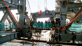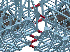 在兩座塔樓頂部的鋼結構完成后,懸臂部分的施工于20078月正式開始,在接下來的5個月內,結構構件從兩座塔樓上逐件向外懸挑出來。承包商在最初的連接階段選擇在懸臂內角安裝7個連接構件。在2007128日上午9時左右,7個構件被吊至適當位置后(在10mm的允許誤差內)用軸承臨時固定后,塔樓慢慢地互相移近。