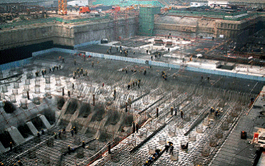動工儀式于2004922日舉行,體積達870000m3的三層地下室的挖掘工程在10月啟動,中國建筑工程總公司于20054月成為工程總承包商。打樁工程始于2005年夏天,而塔樓的筏板則于同年12月動工。第一個柱構件于2006213日完成安裝。鋼構件共計41882件,總重達125000t,在接下來的26個月內完成安裝,最高峰達每月完成8000t。型鋼構件由上海寶鋼和江蘇滬寧完成組裝,然后陸運至工地。