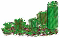 32.8萬m 2,比廣州歌劇院大4倍多。作為開發商,我們要算經濟帳,所以建設時間不能拖得太長,計劃用36個月建成。時間其實非常緊張,但因為采用了BIM系統,所以在計劃時間內如期建成了。給大家透露一下我們的工程成本,6 300元/m 2,擁有如此多雙曲面的建筑,僅用這么低的成本就做下來實在不可思議。在這之前我們做的直上直下的建筑成本大概也要1萬元/m 2左右。那么我們的成本是如何降低的呢?舉個例子,在沒有用BIM施工之前,我們每建一個項目,像三里屯SOHO,建完之后專門有一個20多人的隊伍,叫打孔隊,在設計不完善的地方打個洞讓管子下去和上來,而銀河SOHO這個項目僅應用BIM就在模型中找到了4 000多個碰撞和錯誤,防患于未然,大大減少了返工,節約了工期,這就是BIM給我們帶來的幫助。