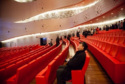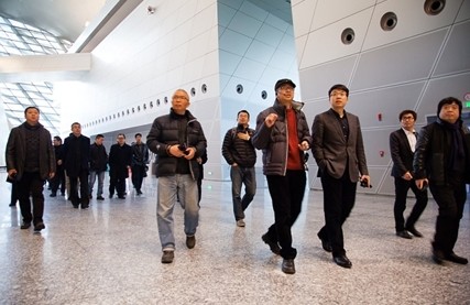 演講結束后,崔巖總建筑師親自帶領到訪的建筑師及學者們從議會廳出發,沿著中間扭轉曲面劇院拾級而上,一一為大家上詳細解說了每一個功能空間的設計細節及建造工藝。從金屬材料的鋪裝到建構體系的支撐,構成了建筑內部極具張力和感染力的室內空間,到訪嘉賓無不表示贊嘆,并就設計及建構等層面的問題與崔巖總建筑師進行了積極的互動。