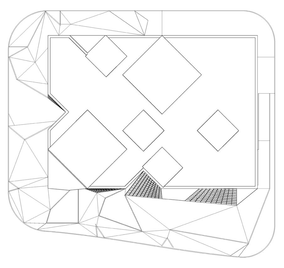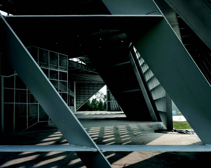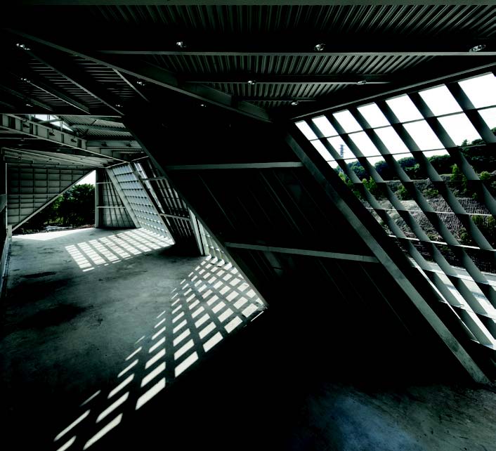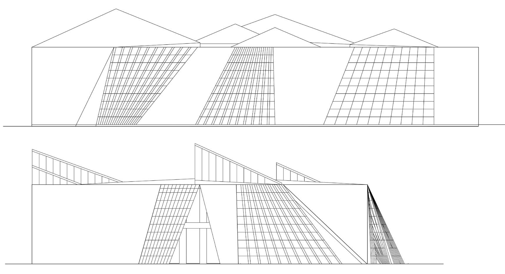 幕墻全尺寸試樣焊接完畢后,焊縫的處理成為一個難題。預想的處理方法是焊接完成后逐一打磨,由于焊縫的數量大,打磨費工費時。通過試樣發現,打磨用的砂輪會在焊縫周邊留下明顯的痕跡,表面噴涂后痕跡會更加明顯。如果保留焊縫,整體效果將十分粗糙。是否打磨焊縫成為一個兩難的選擇。正當設計陷入困境時,走訪加工單位發現,用于加工鋼板的折彎機可以精確地按照預定角度將鋼板折彎。因此,我們提出將三角形幕墻單元兩兩組合為四邊形單元,對角線用折彎機加工,這樣僅焊接四邊即可。這一方法大大減少了焊接量。折彎的壓痕形成精細的轉折線條,與周邊粗獷的焊縫形成對比。幕墻整體形成了對角線與四邊形兩個方向網格交織的特殊肌理,在不同光線下將產生微妙的光影變化。
