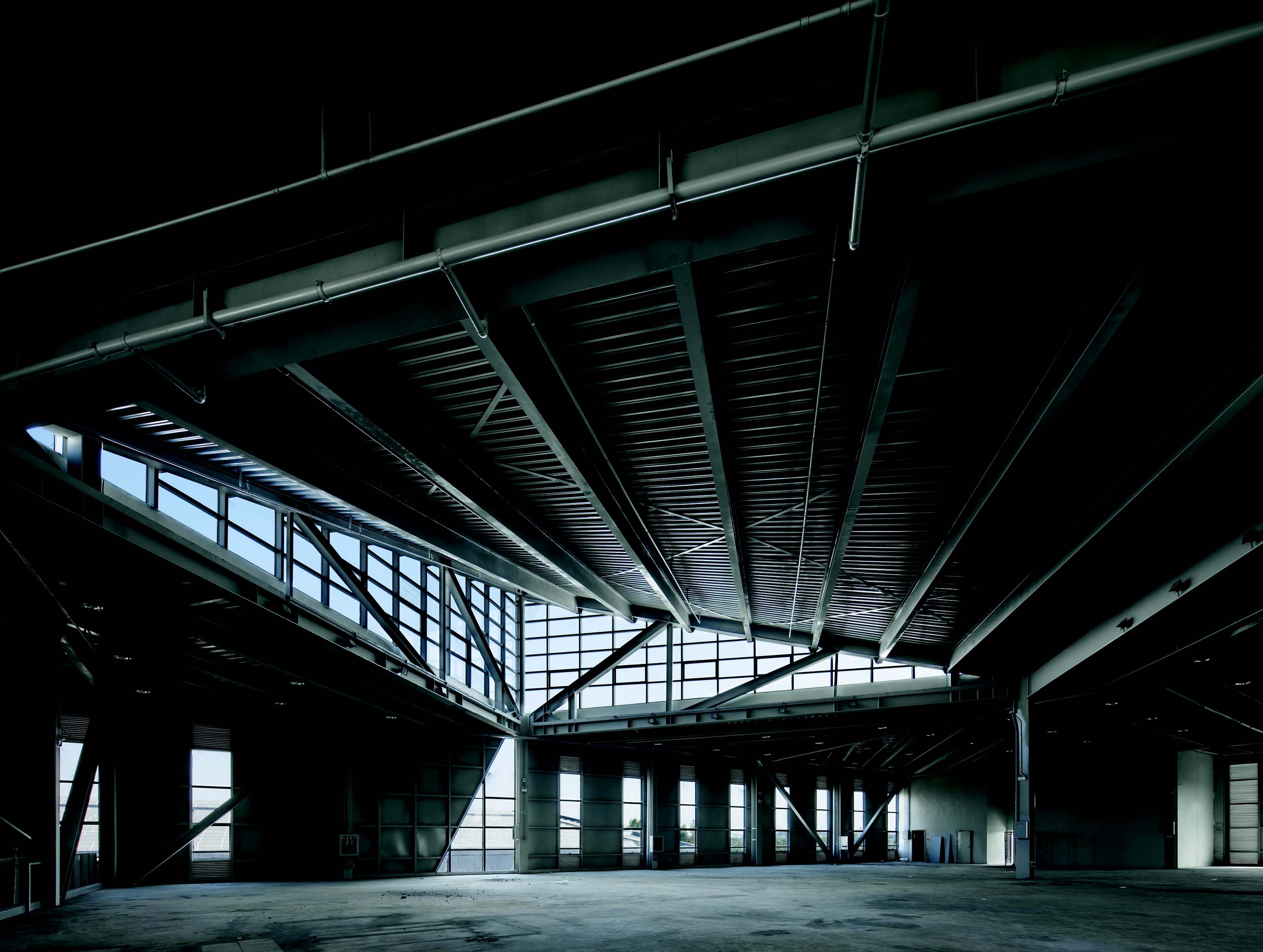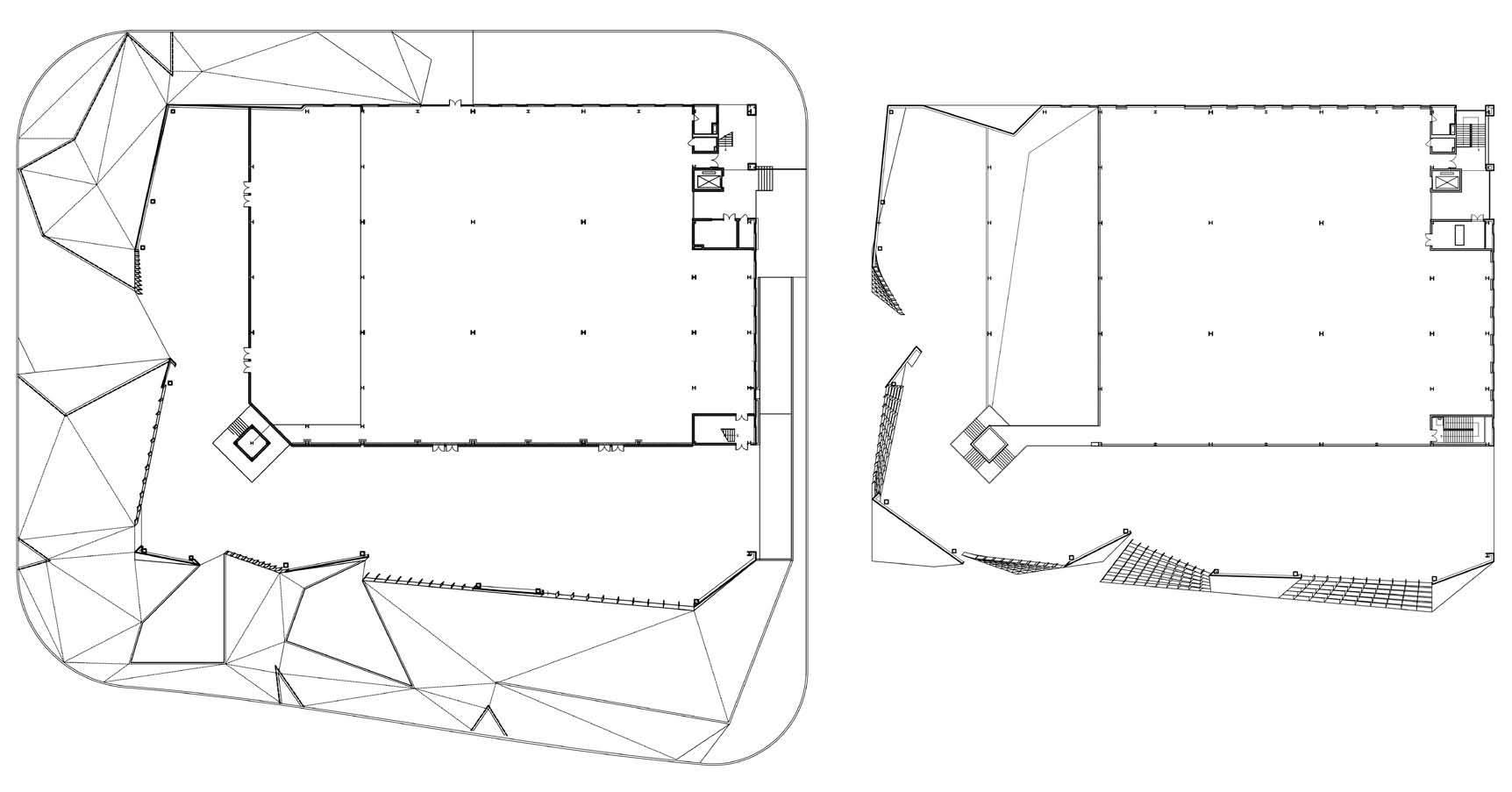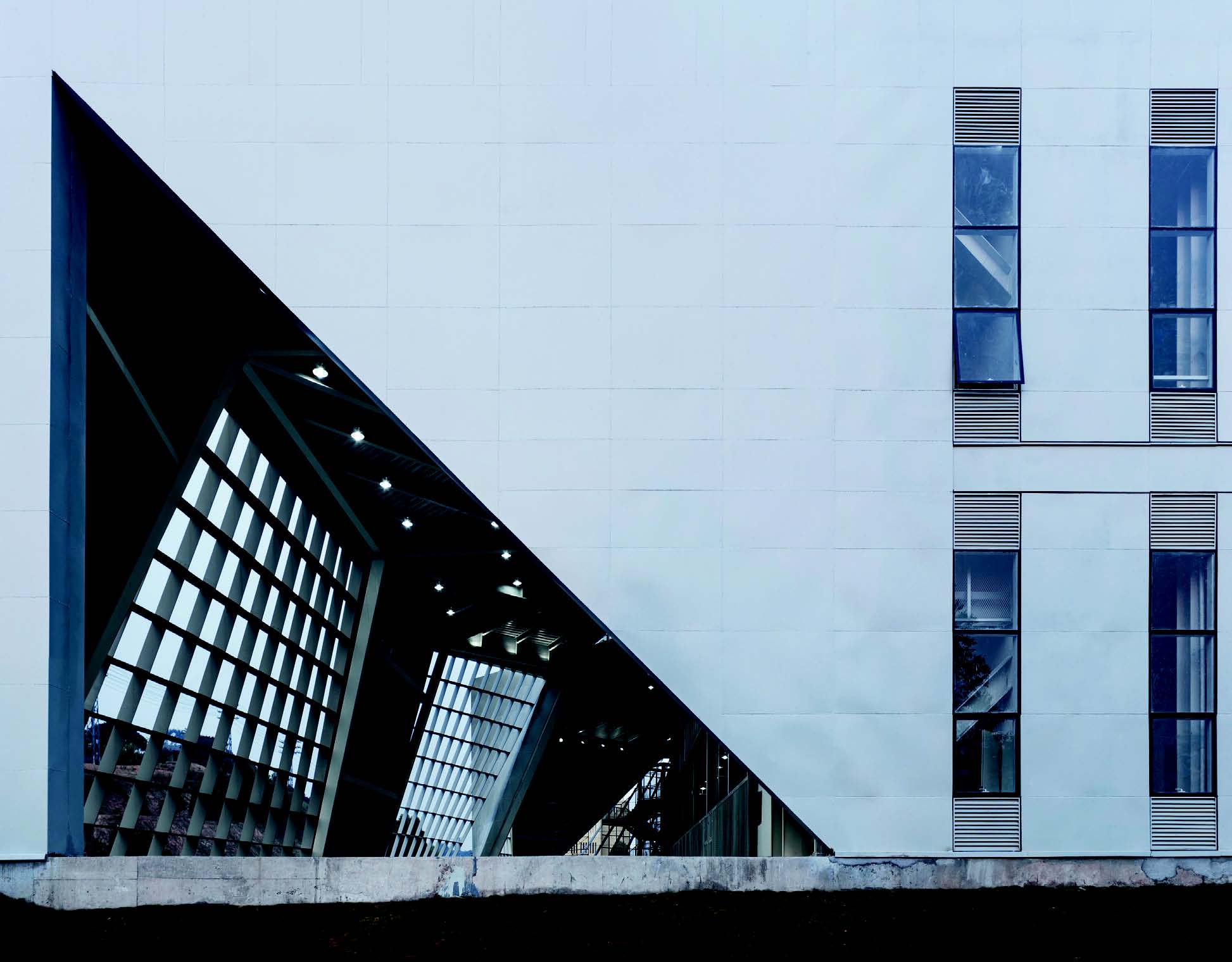 幕墻全尺寸試樣焊接完畢后,焊縫的處理成為一個難題。預想的處理方法是焊接完成后逐一打磨,由于焊縫的數量大,打磨費工費時。通過試樣發現,打磨用的砂輪會在焊縫周邊留下明顯的痕跡,表面噴涂后痕跡會更加明顯。如果保留焊縫,整體效果將十分粗糙。是否打磨焊縫成為一個兩難的選擇。正當設計陷入困境時,走訪加工單位發現,用于加工鋼板的折彎機可以精確地按照預定角度將鋼板折彎。因此,我們提出將三角形幕墻單元兩兩組合為四邊形單元,對角線用折彎機加工,這樣僅焊接四邊即可。這一方法大大減少了焊接量。折彎的壓痕形成精細的轉折線條,與周邊粗獷的焊縫形成對比。幕墻整體形成了對角線與四邊形兩個方向網格交織的特殊肌理,在不同光線下將產生微妙的光影變化。