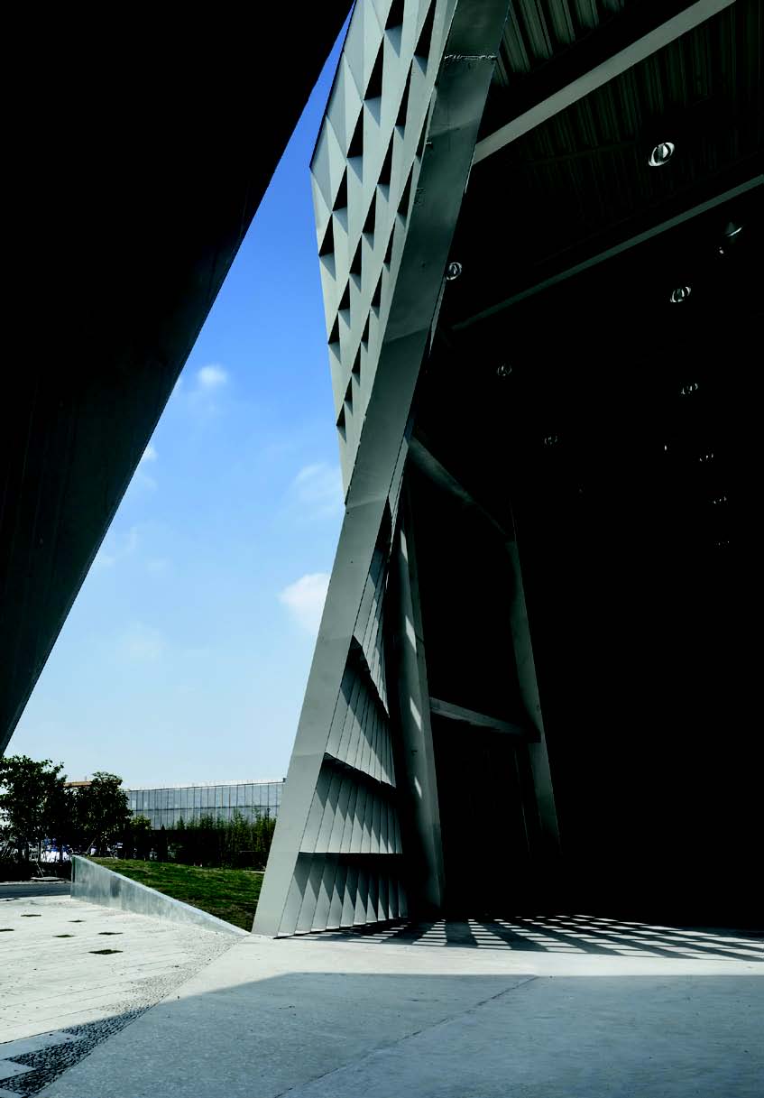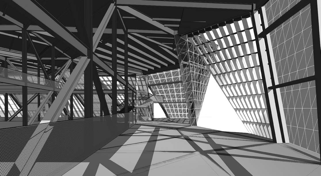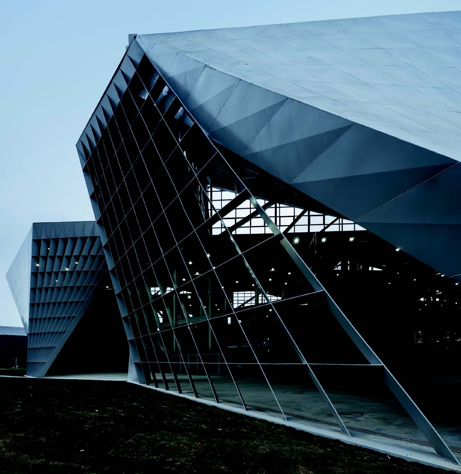 萬科創展中心位于東莞松山湖萬科集團住宅產業化研究基地內,是萬科集團住宅建筑設計、住宅精裝修研發與展示的基地。內部要求14m柱跨的通用空間。用地北部為已建成的研究廠房,南側為基地邊界的自然土坡。結合內部空間要求和外部環境,創展中心由14m柱跨的方盒子開始,將屋頂及東側、南側的墻體撕裂、扭轉,形成光線和空氣進入建筑的通道。扭轉的墻體虛實相間,分別轉化為封閉的曲面鋼幕墻和扭曲的鋼格柵。支撐斜柱隱藏在曲面幕墻內,鋼格柵在增強通風效果的同時,也作為遮陽構件起到遮陽作用。兩者虛實相間形成的豐富形體與南側自然地形相呼應。為了實現這一設計構思,從幾何形態、參數化設計技術、構造節點等方面提出了相應的措施。