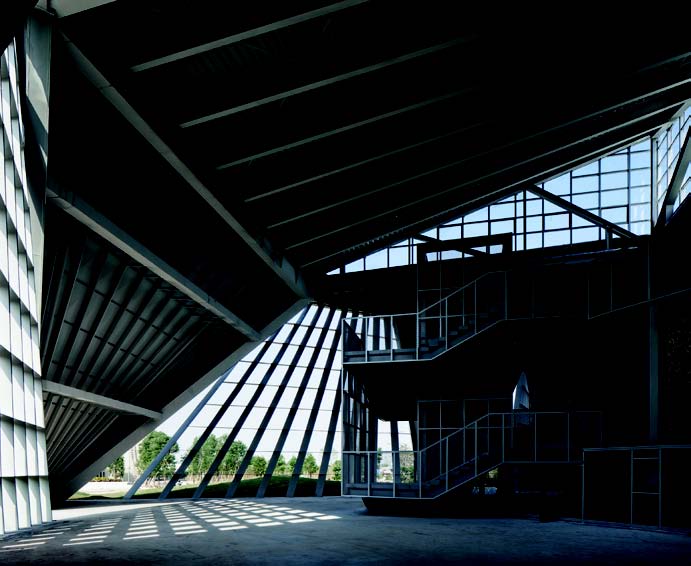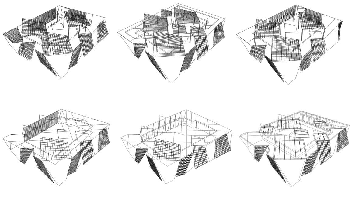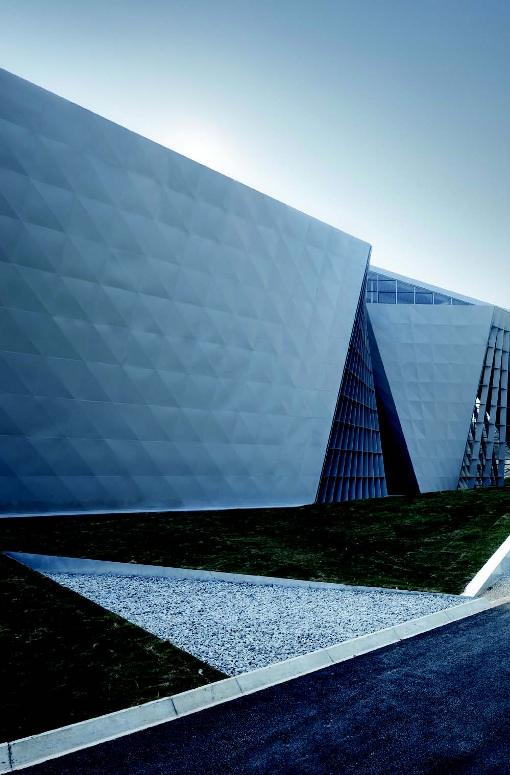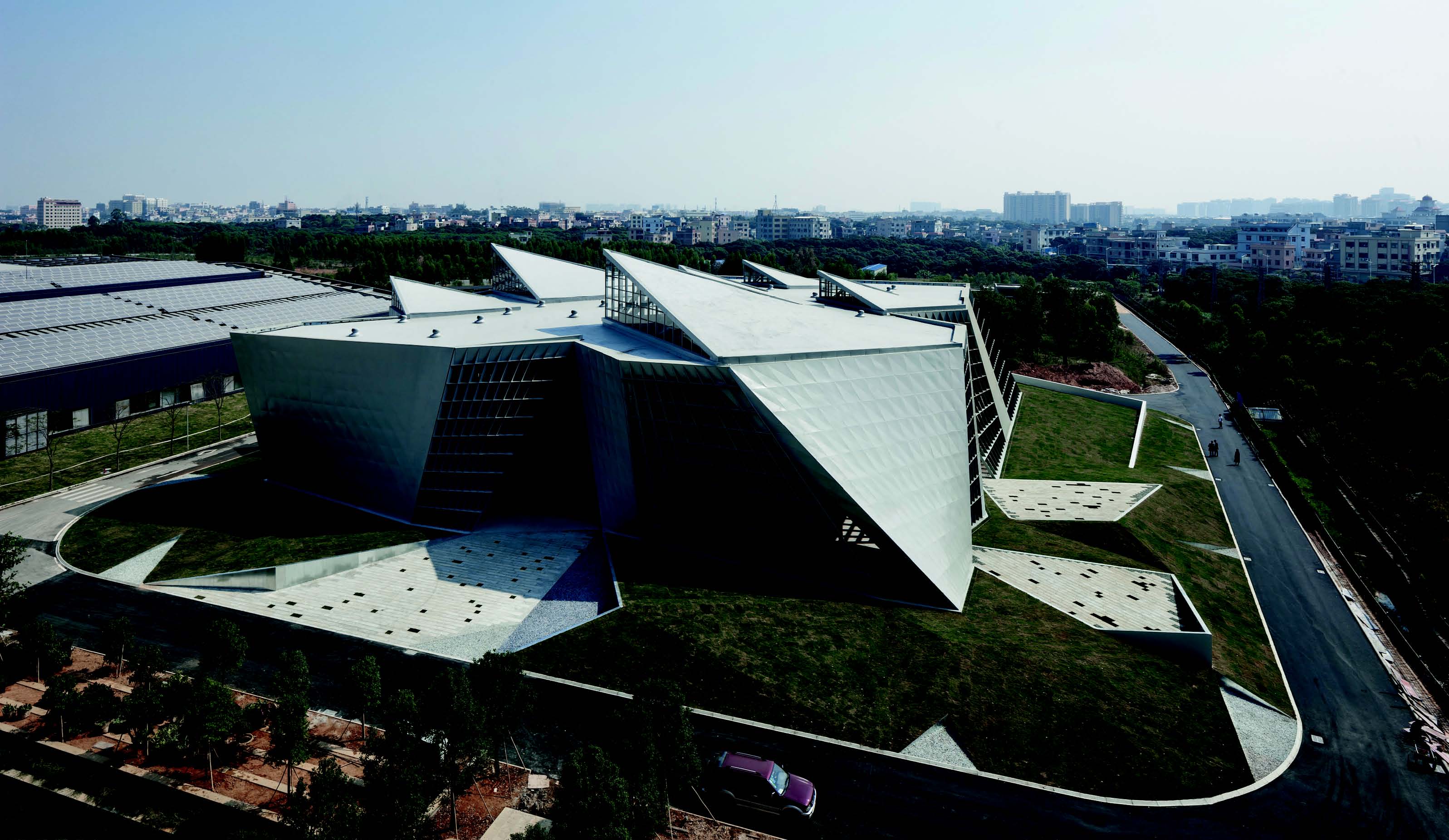 萬科創展中心位于東莞松山湖萬科集團住宅產業化研究基地內,是萬科集團住宅建筑設計、住宅精裝修研發與展示的基地。內部要求14m柱跨的通用空間。用地北部為已建成的研究廠房,南側為基地邊界的自然土坡。結合內部空間要求和外部環境,創展中心由14m柱跨的方盒子開始,將屋頂及東側、南側的墻體撕裂、扭轉,形成光線和空氣進入建筑的通道。扭轉的墻體虛實相間,分別轉化為封閉的曲面鋼幕墻和扭曲的鋼格柵。支撐斜柱隱藏在曲面幕墻內,鋼格柵在增強通風效果的同時,也作為遮陽構件起到遮陽作用。兩者虛實相間形成的豐富形體與南側自然地形相呼應。為了實現這一設計構思,從幾何形態、參數化設計技術、構造節點等方面提出了相應的措施。