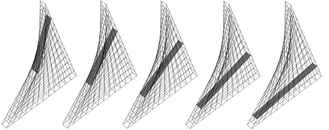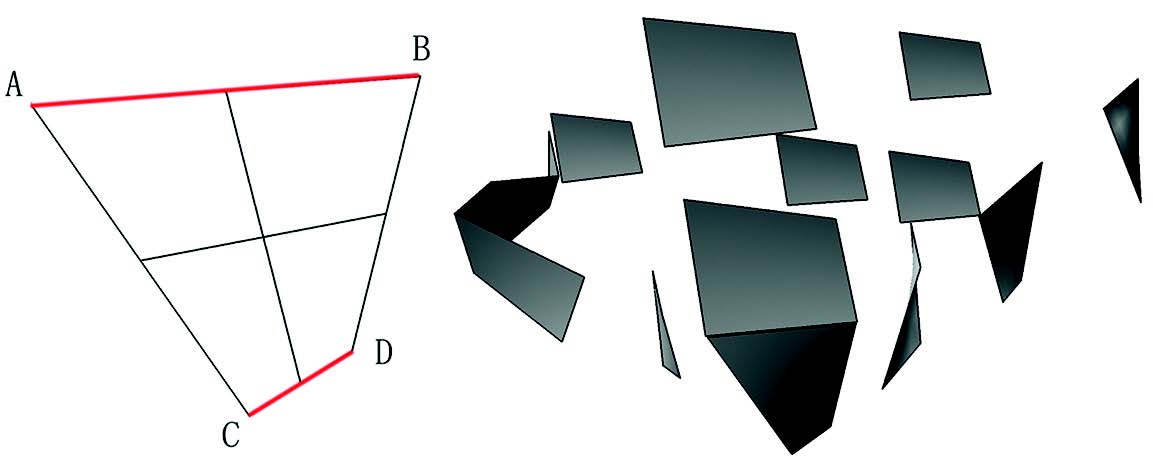 非標準構件的幾何形體如果在三維方向同時變化,需要進行三維數控加工,造價高昂。如果將非標準構件的形狀變化限定在二維平面內,其造價就會大幅降低。走訪本地加工廠發現,很多常規的直線形構件也采用數控加工,數控加工技術的普及為設計的實現提供了現實基礎。在加工費用上,以數控切割機為例,加工平面內的曲線形構件與加工直線形構件單位時間的加工費相同,不同之處在于材料的利用率。根據這一加工條件,創展中心將構件形狀變化限制在二維平面內,同時利用合理的幾何選型,將構件進一步簡化為直線形構件,提高了材料利用率,降低了總體造價。在多種自由曲面類型中,滿足這一要求的是由空間中不共面的兩條直線定義的規則曲面,而沿兩條邊等分線的連線均為直線。這一特性方便了后期加工,建造過程中的定位也比較方便。規則曲面的弱點在于形態變化不夠豐富,因此創展中心采用多組規則曲面的組合,構成豐富的形態變化。