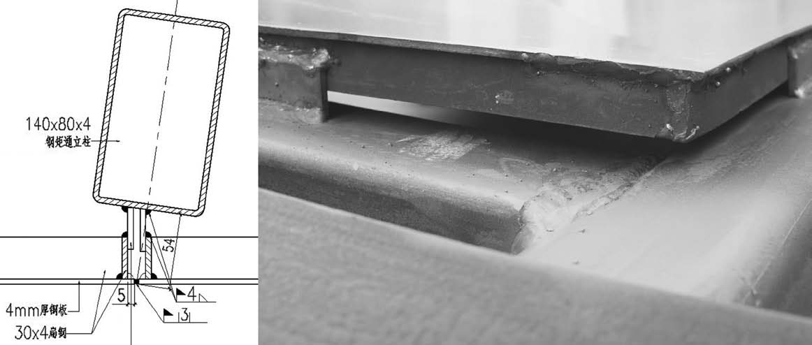 曲面鋼板幕墻是由多個小的平面單元拼接而成的,初期方案擔心安裝精度難以保證,將幕墻單元拼接設計為明縫。這一設計需要在鋼板背面增加防水層,構造復雜,造價難以承受。因此將幕墻拼縫改為焊接密封,焊縫允許的最大寬度有限,且幕墻單元數量較多,精度要求較高。幕墻節點設計進行了不同方案的試樣對比研究,最終采取在每一幕墻單元設可調節的定位鋼片進行初步定位,待整片幕墻對縫確認完畢后再進行焊接固定的方法。實際應用的效果簡便易行,安裝快速。