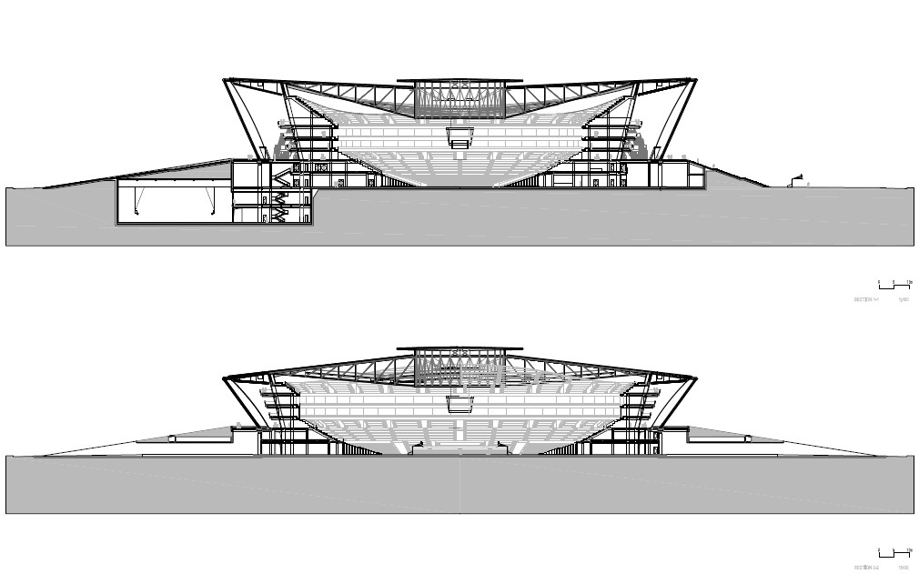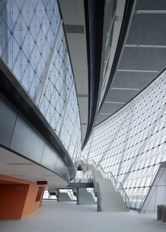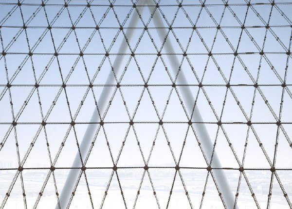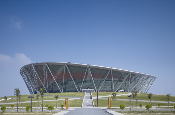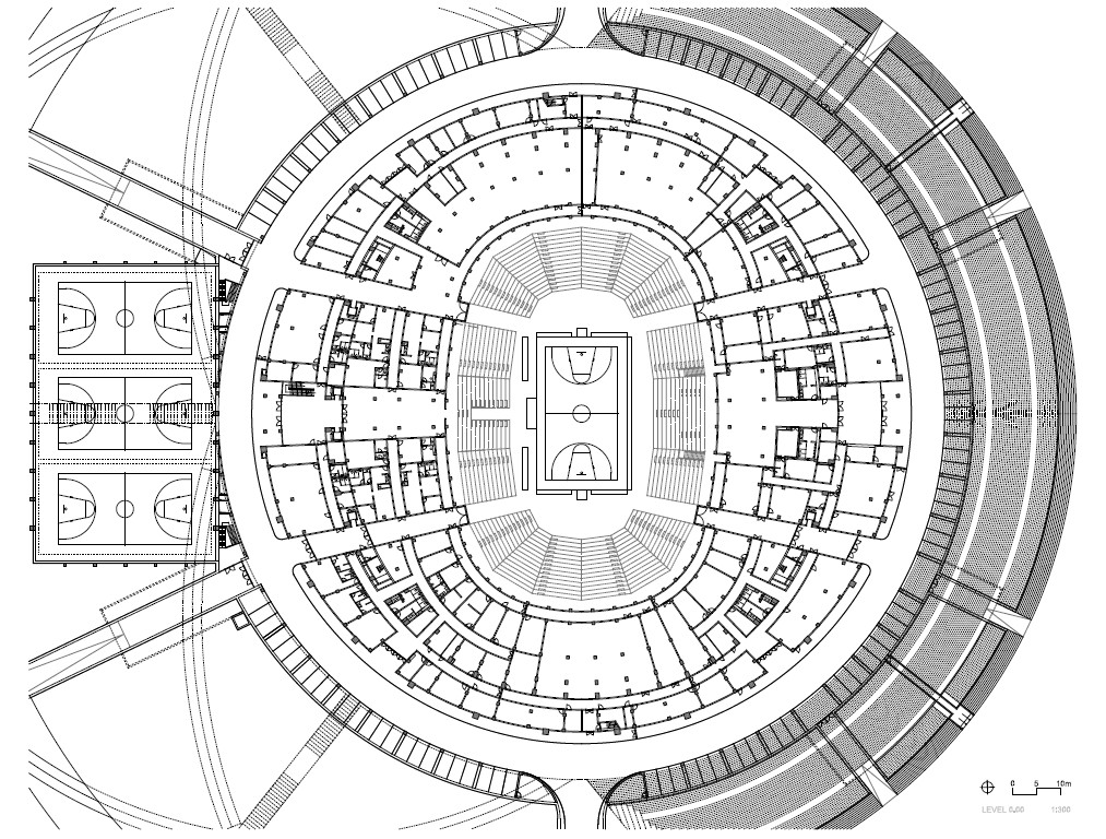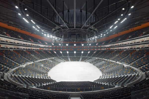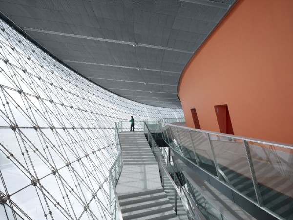 體育館豐富多樣的設計手法再現了籃球運動的幾個元素:建筑主體位于一座抬高的基座上,屋面環狀流線令人聯想到籃筐的邊緣,網狀的立面系于其下。賽場主體外墻顏色采用籃球所有的典型橙色,在網狀幕墻結構之后格外鮮明,另外賽場內部也使用了橙色進行裝點。放射狀的屋面直徑157米,為一個外置呈波浪狀的壓力環。其上懸掛了28根鋼柱,對屋面的桁架結構起到穩定加固的作用。屋面坐落于之字型鋼柱之上。體育館外立面為世界范圍內首次使用的三向網格曲面索網幕墻體系,并以中空安全玻璃封閉。