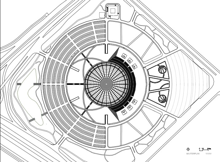 體育館為一個大型公園所環抱,是喧鬧的大街到體育館之間的緩沖地帶。公園綠地的規劃采用了與體育場造型的元素。寬闊的綠化帶、水邊蜿蜒的小徑圍繞著體育館四周,提供了理想的室外運動休閑場地。