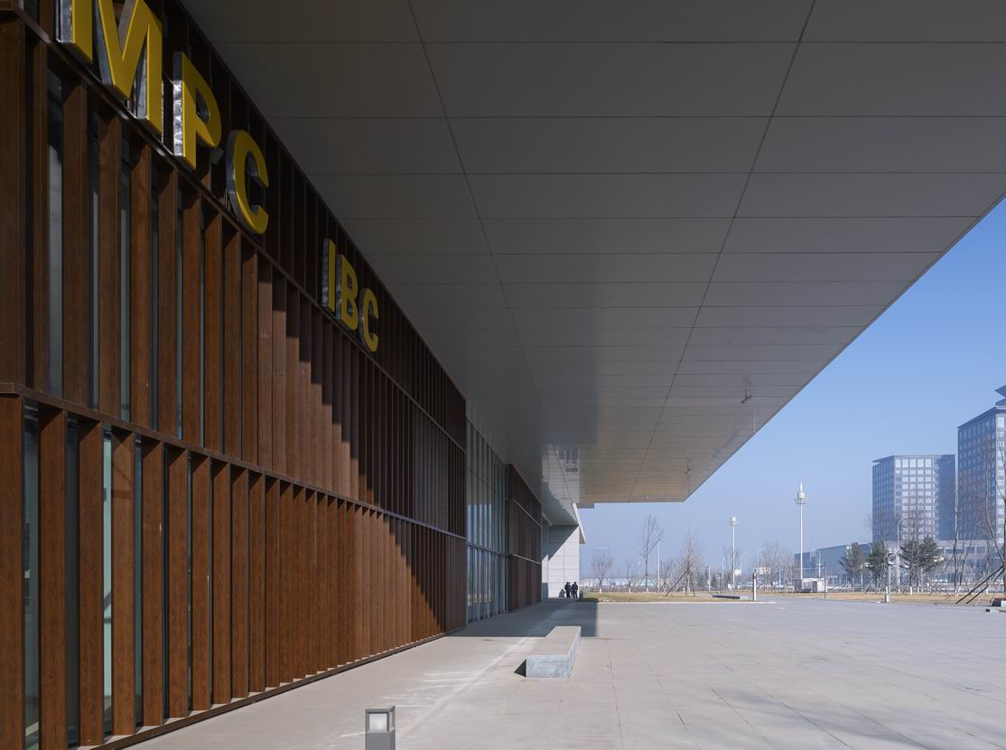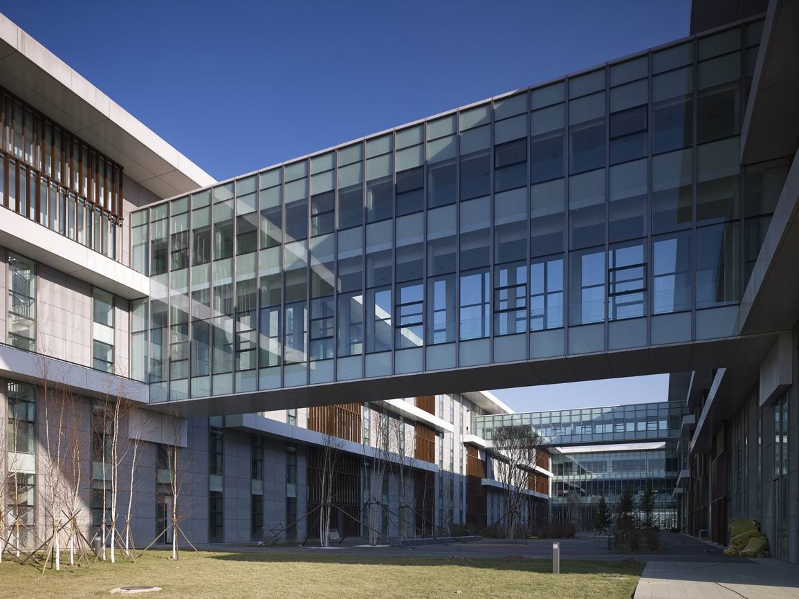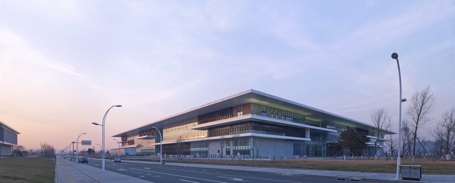 在外墻選材上,深灰色花崗巖板、淺灰色鋁蜂窩板、淺藍色玻璃幕、紅色鋁材相間,水平線條流動、舒展,細部設計及材料對比細致入微。