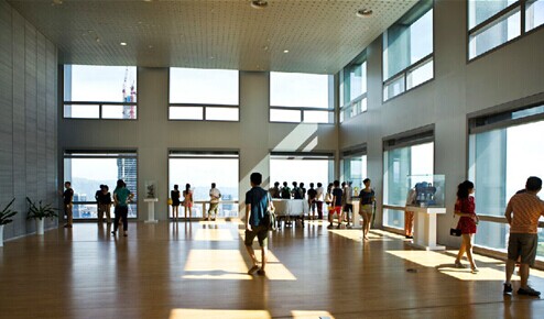 抬升的平臺東西長162米,南北寬98米。平臺上有四個樓梯、四個天井。四個樓梯是疏散樓梯,可以通過塔樓轉到地面;四個天井是九層的采光天井小花園。 深交所大樓為中國首批綠色三星建筑之一,很多細節的設計都體現了這座大樓的可持續性。漂浮平臺上巨大的遮蔭亭頂層及平臺邊線放置太陽能遮光板,收集起來的太陽能可以滿足部分塔樓的電能需求。站在漂浮平臺上,明亮的幕墻反射出云朵、天空的顏色和陰晴變化。在這離地63米的大平臺上運動或休憩,帶來一種全新的視覺和空間體驗,曾經熟悉的風景都變得迥然不同,仿佛是城市的第二層空間。