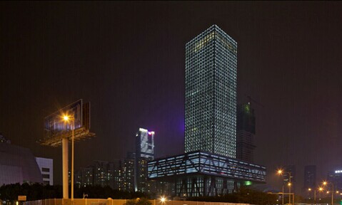深交所大樓的夜景也是非常漂亮的,燈光也經過了專門的設計。這種燈光跟那種五顏六色或者組成圖案燈光不同,是把每一個景觀窗以及飄浮平臺照亮。燈光主要是為了照亮建筑本身,而不是作為一種宣傳廣告或者其他存在。抬升裙樓底部吊頂天花也可以亮起來,效果非常震撼。