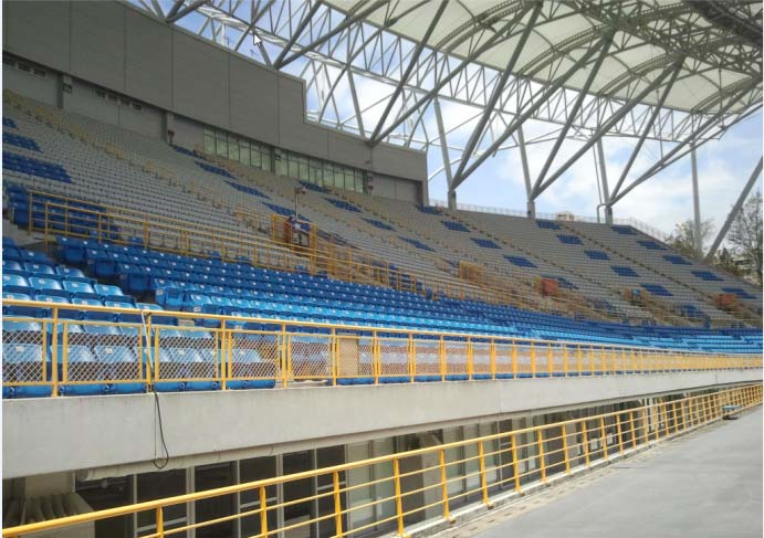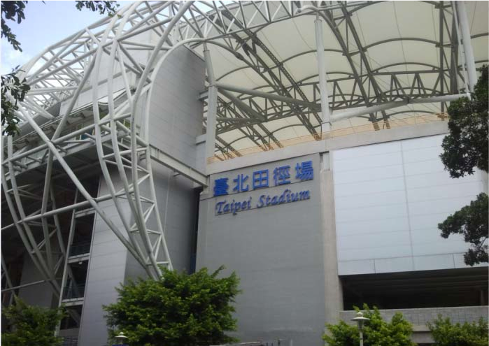 預制裝配式體育場建于臺北市,建筑面積為27 585m2,建設工期為19個月(2007年3月~2008年10月);看臺結構采用預制混凝土結構體系,看臺板采用預制混凝土結構,看臺上部雨棚結構采用鋼結構 膜結構。在項目的建設過程中,設計團隊采用BIM技術,進行體育場館機電管線的碰撞檢測和消防管線的接頭位置處理。