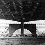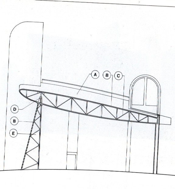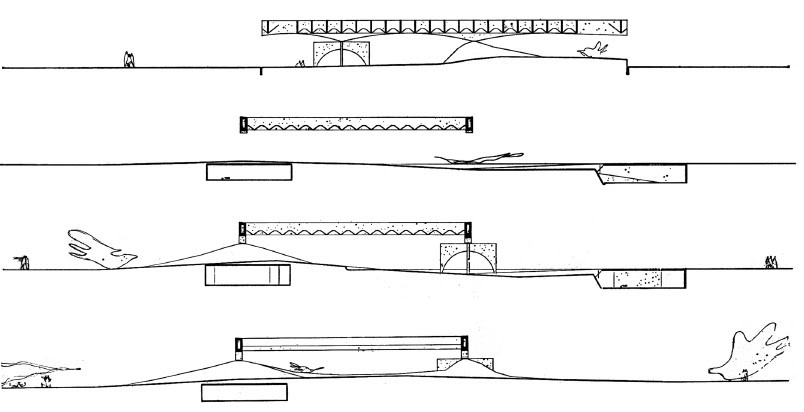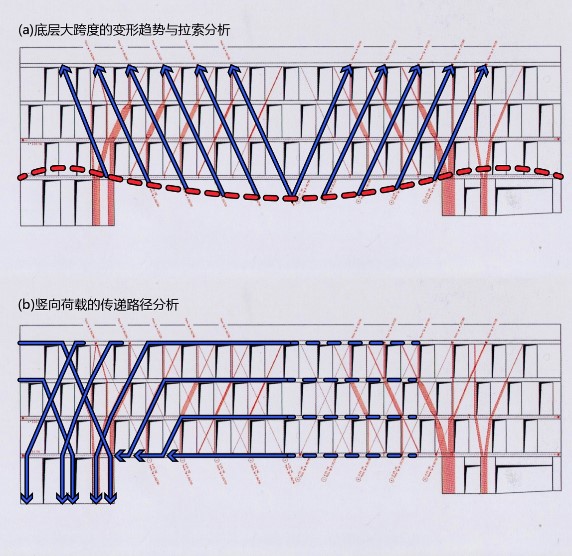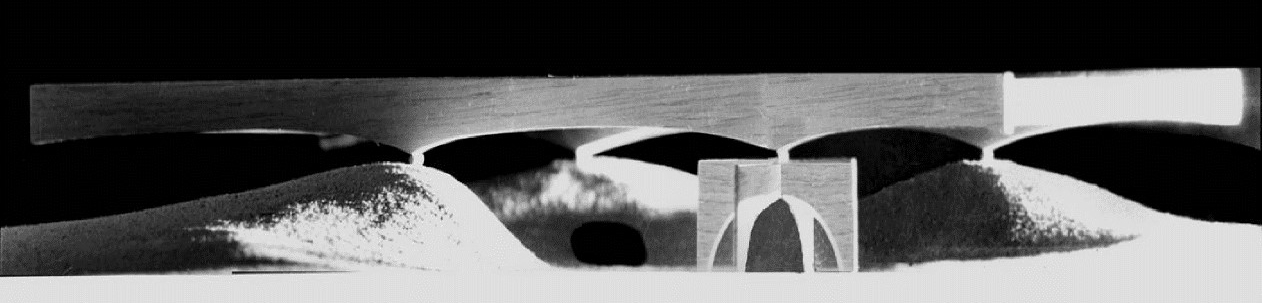 使用較重的混凝土之后,對支座的拉力會使其底部產生巨大的傾覆力矩。為此,巴爾蒙德在兩端的剪力墻上設置了一系列垂直的鰭狀片墻抵抗側向的拉力,并在地下采用了一系列橫穿整個跨度的地梁來連接兩端的基礎。地梁起到了拉桿的作用,把所有的構件連接在一起形成了一個完整的荷載回路,位于空中的拉力與地下的反推力形成閉合,并與支座相連。