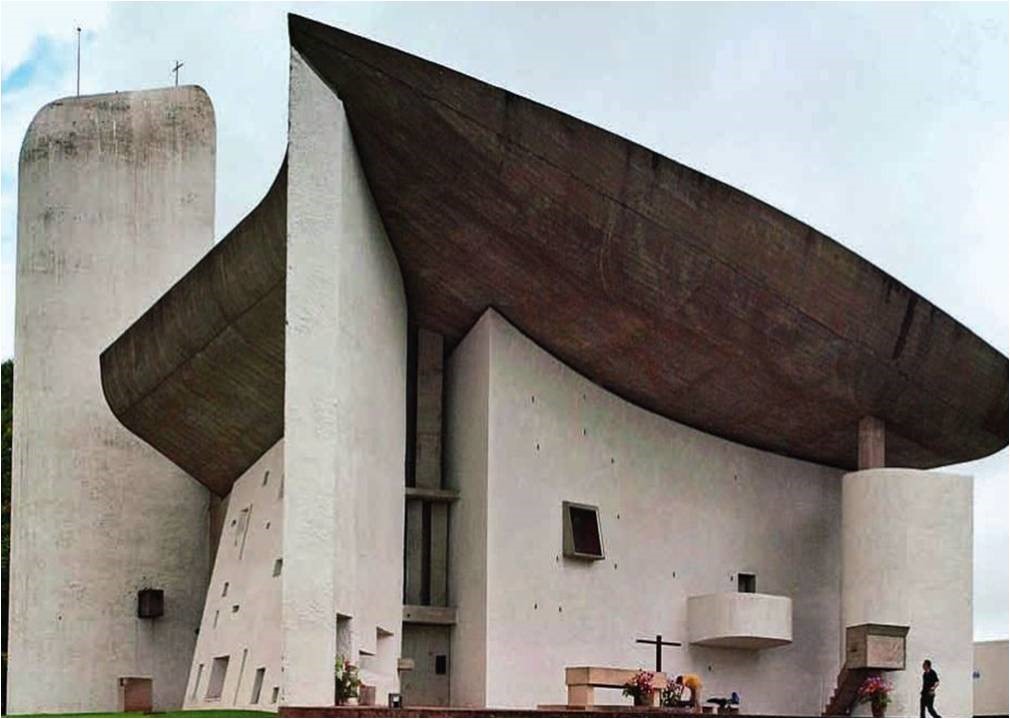 朗香教堂雖然使用噴射混凝土的外表皮,但是沒有工業技術的冰冷,反而是溫暖的“貝殼”融入場地之中??梢哉f,朗香教堂正是用其怪誕的方式詮釋了工業制品的“詩意”與“快樂”。