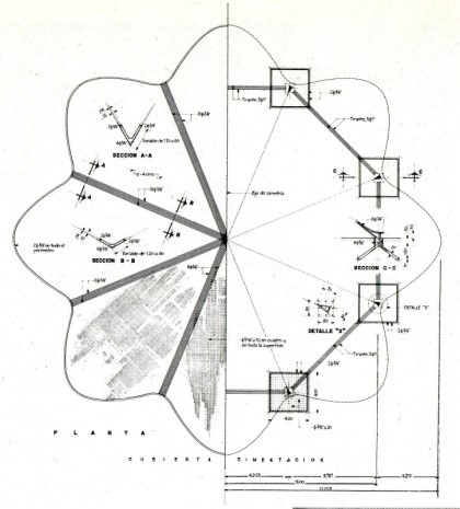 通常情況下,殼體拱交叉處的靜荷載會使得拱向外彎曲,偏轉產生的力垂直于外殼的表面,從而形成由外向內的邊緣裂紋。雖然邊緣肋骨有助于減輕這些裂紋,但是會使建筑邊緣厚重。對此,坎德拉認為問題的關鍵在于解決交叉拱處的受力。餐廳中的每個交叉拱處形成一個V字形梁,混凝土梁中加配鋼筋。這些梁提升交叉拱處的剛度,減少拱的彎曲和變形,同時將邊緣力拉向交叉拱處后,再傳遞到地基,從而解放邊緣。建筑支撐件是V字形梁倒置于土壤中,獨特的基腳處理防止殼體沉沒在潮濕的墨西哥土壤;同時為了抵抗側向推力,相鄰地基用Ф1鋼筋相連。