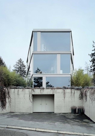 名為“一墻宅”的這座兩戶住宅位于瑞士蘇黎世東南端一個狹窄的斜坡地段上,建筑僅通過曲折的混凝土墻將兩戶完全隔開,并限定每戶使用空間。為更好地享有戶外景觀,各戶的主要功能沿著折墻在垂直方向展開,從下往上依次為工作室、起居室、廚房、臥室和浴室。