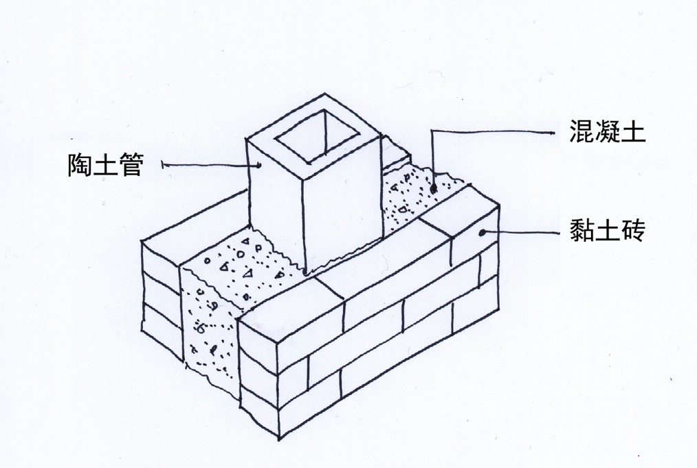 現澆混凝土結構的層與層之間通過“陶土管”結合:陶土管的一端預埋在下層的混凝土中,當混凝土凝固之后,繼續砌筑磚墻,上一層的混凝土將淹沒陶土管的另一端,陶土管的作用類似于預留鋼筋。