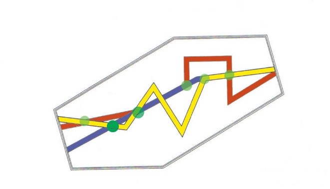 建筑的結構設計追隨著“用一道墻將室內劃分為兩半”的功能方案執行,400mm厚的鋼筋混凝土墻同時也支撐著寬闊的懸挑樓板。墻的形態在平面上呈折板狀,而折角的位置與角度在各層都不一樣。與直線的墻體相比,折板墻體具有更好的抗彎性能和穩定作用。各層墻體的交接之處形成“柱點”,頂層墻體通過分段懸挑的形式將荷載交匯于頂層墻體與地面層墻體的 “柱點”,再通過預施的拉力將荷載引導至地面層墻體與底層墻體的“柱點”,最終由底層墻體將荷載傳入大地。由于墻體和樓板作為一個整體,建筑在剖面上可看成三段堆疊的“工字鋼”,增加了建筑的整體性和穩定性。