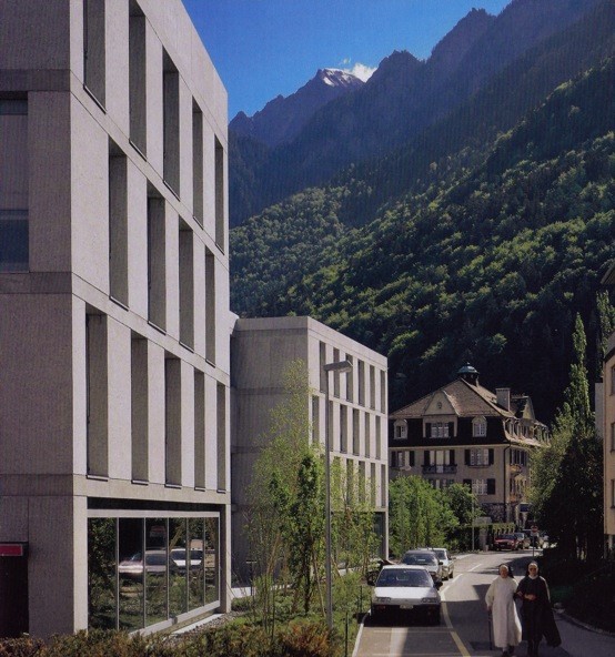 奧拓廣場大樓位于庫爾的歷史風貌舊城區,被3道承重實墻分隔開,形成4個跨度在20~30m之間的盒子。建筑混合商業、辦公室和公寓,其中辦公和公寓這些小空間的功能集中在上部,由內部走廊串聯,而底層空間由于功能難以確定,因此設計師希望創造完全不受限制的內部空間。