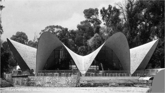 霍奇米爾科水上公園餐廳是由費利克斯?坎德拉設計的殼體式建筑,四個相交的雙曲拋物面形成的八角形交叉拱向四周展開,采用無梁柱薄殼結構,輕盈的形體巧妙地融入景物之中。