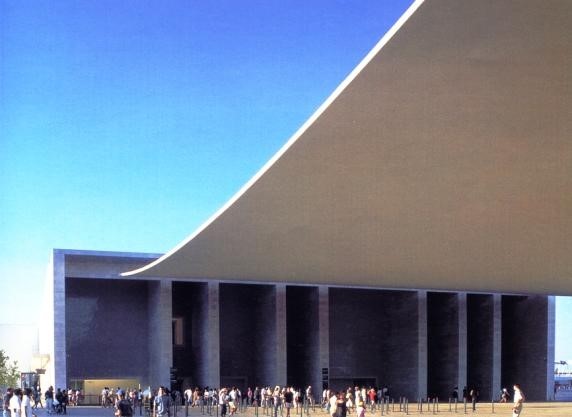 1998年里斯本世博會的葡萄牙國家館體現了西扎所追求的“純凈”概念,同時也是優秀的結構表達。這一片長65m、寬58m、離地高度最低10m的巨大懸拉結構所遮蓋的半開敞公共大廳。從遠處看,它就像海洋上一只潔白的橫帆,猶如天然懸垂的輕柔帳