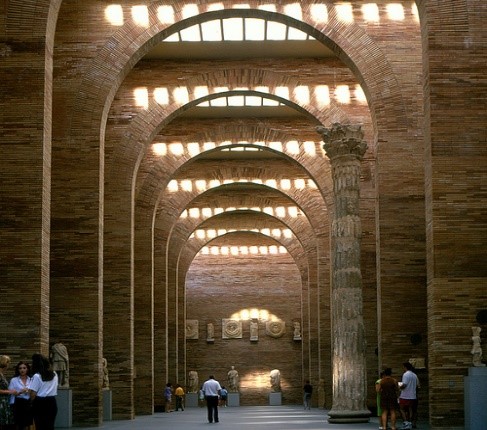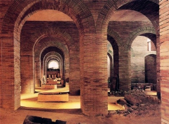 古羅馬藝術博物館位于西班牙梅里達,處于廢墟之上。莫內歐為實現新舊建筑之間的完美共存,摒棄了用大跨結構跨越廢墟的做法,將混凝土這種強度較大的填充粘結材料澆筑在兩面薄且平的磚墻之間,即用磚砌成雙層拱圈,爾后在其中澆筑混凝土,最終形成復合結構從而實現較大的跨度。磚墻作為“永久模板”保留在混凝土的外表,在獲得高強度的同時也保留了磚建筑細膩的肌理感和清晰的建構邏輯。