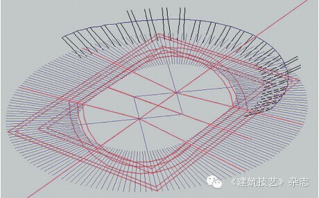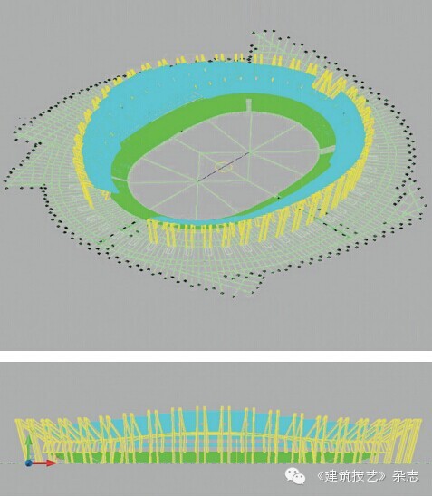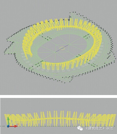 此項目工期短、難度大,從設計、施工到構件加工、現場裝配都有難度,再加上設計院前期提供的圖紙不是很完善,只有體育場整體模型(圖13),尤其是二層看臺現澆階梯梁平面布置復雜,平面投影呈折線形,設計院結構專業沒有定位圖,提供的計算模型導出圖(圖14)可以作為參考,但不能作為指導深化設計的依據,所以此現澆階梯型折線梁的空間定位