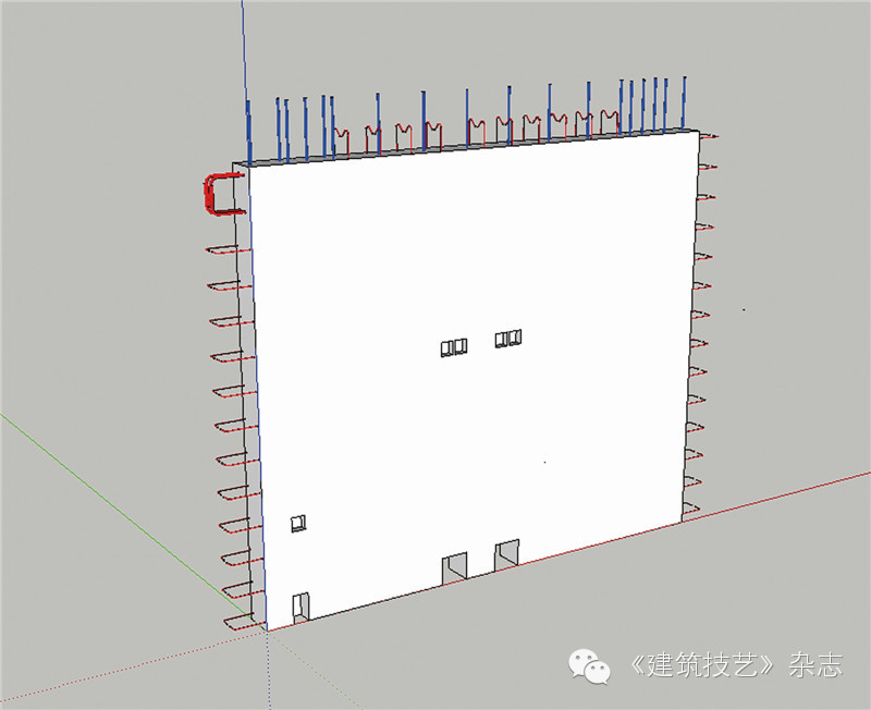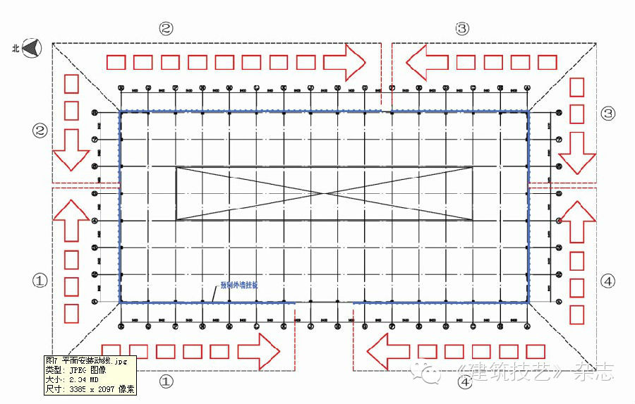 由于該項目建筑平面尺寸較大墻板的水平向和豎向均采用企口接縫。外掛板的安裝順序非常關鍵,設計階段應考慮掛板安裝順序,豎向要求從低到高逐層安裝,水平向應從四個角點向中間安裝,經過反復研究和優化,制訂平面安裝動線(圖7)。