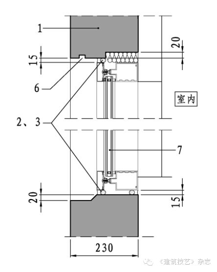 (3)窗口周邊做防水企口,窗框與掛板接縫用密封膠封閉,上口做滴水槽,下口做坡水設計(圖5c)。