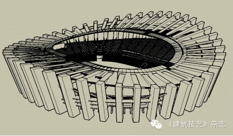 本項目位于內蒙古自治區鄂爾多斯市,主體采用鋼筋混凝土框架-剪力墻結構體系,看臺坐席數6萬座,分低區、高區看臺,所有看臺采用清水混凝土預制看臺系統(圖12)。