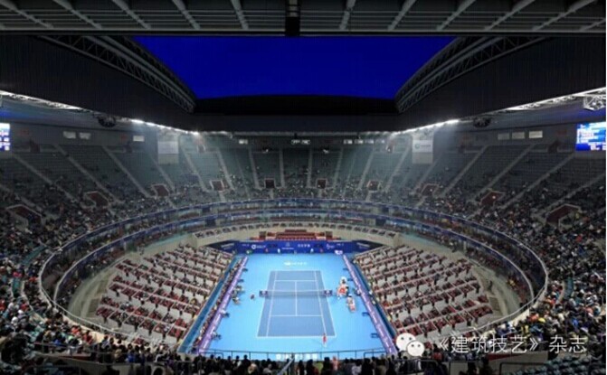 作為中國網球公開賽的專用場館,由中國建筑設計院有限公司一合建筑U11工作室設計的國家網球館位于北京奧林匹克園區內,是北京最大的網球專用場館。國家網球館新球場的設計采用16組V型合柱支撐看臺和建筑外維護系統,建筑外立面和結構的V型體系完美結合,以類三角形建筑語言統一整體。為應對比賽期間的天氣變化,鉆石球場安裝了開啟式活動屋面,60m×70m的最大開合尺寸堪稱亞洲之最,12分鐘完成開啟。