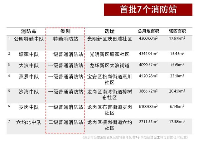 隨著深圳社會經濟和城市建設的快速發展,消防安全保衛任務日益繁重,而現有消防基礎設施和裝備配置相對滯后于城市發展水平,消防警力也明顯不足。為擴充我市消防隊伍規模,改變目前消防設施和警力不足的現狀,合理布局特區內外消防站點分布,增強城市抗御火災和處理突發性災害事故的能力,擬在2019年之前深圳市將新建消防站50座。首批立項的消防站7座。