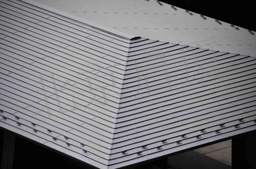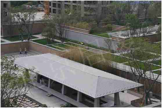 中國古建筑的四坡屋頂采用陶瓦材料,但陶瓦材料存在諸多缺陷,如重量大,抗震性差,耗費土地資源,極易破碎,安裝速度慢,防水效果不好,強度低,遭遇大風、冰雹等惡劣天氣時容易損壞等,已經落后于時代發展,難以滿足現代建筑技術對屋面材料的要求。但是大明宮項目作為典型的中式建筑,萬科集團和建筑師一致要求屋面系統在外觀上必須能夠表現東方傳統建筑文化的理念,這是一條不能突破的紅線。為了滿足業主和建筑師的要求,屋面承建單位北京啟廈建筑科技有限公司推出了橫鋪階梯屋面系統。這種以現代工藝加工制作的金屬板材,不僅能夠避免傳統屋面材料的種種弊端,更能以其特有的外觀以及強烈的層次感原汁原味地展現古樸高雅的中式屋面建筑效果。經過多方考察比較,最終確定了采用深灰色的橫鋪階梯屋面系統作為冬院茶室、夏院涼亭和樓宇大堂的坡屋面材料。