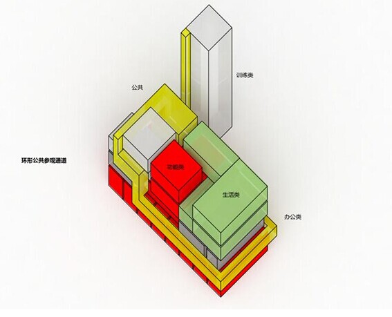 基于上述分析初步形成消防站的建筑原型,黃色部分為環形公共參觀流線,可變動;藍色、綠色部分作為標準化,不允許變更。而再將此原型應用到不同基地,就產生了豐富的多樣性,可以以此適用于不同的場地。