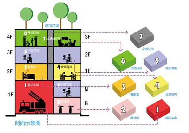 深圳普集建筑設計顧問有限公司獲得評委票選第二名,匯報人楊小荻應用設計思維,引入關聯性設計的設計方式,“我們不是設計某一個消防站,而是一個系統”,實現不同基地上的標準化。他將消防站的功能結構分類再重新打散組合,其中功能類的需要時簡單高效、辦公生活類則要求隱私舒適,公共類可開放宣傳。提供更好的生活和工作環境、利用屋頂多層平臺、考慮獨立的參觀流線是他主要考慮的幾個點。
