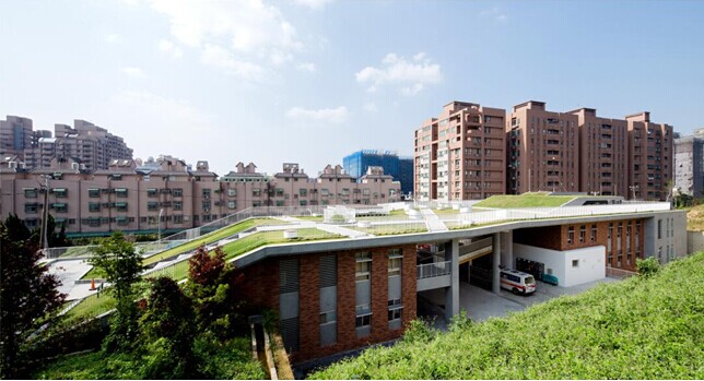 許智凱分享了他做過的臺灣桃園市大有消防分隊設計案例,以及現有制度下消防隊如何與社區、環境和生活更積極的互動。大有消防站基地旁邊有個局部開建的公園,后方有一座寺廟,因此在建設時,希望可以降低建筑物對公園的影響,尊重寺廟的視界,并且讓公眾利用建筑的大屋頂。建筑完成后,就想隱身在公園下方,在不影響消防工作的前提下創造與環境雙贏。