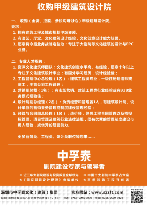 據了解,此次中孚泰對于收購設計院雖要求嚴格但誠意十足。公告顯示:對于收購目標中孚泰有三大要求:首先需擁有建筑工程及城市規劃甲級資質;其次,需有演藝、廳堂、文化建筑設計經驗,尤其是文化創意設計能力需突出;最后,設計院今后業務戰略需與中孚泰保持一致,專注于大劇院等文化建筑的設計與EPC業務。但在嚴格的要求之下,中孚泰也表示就于收購形式,全資、控股、參股均可討論。
