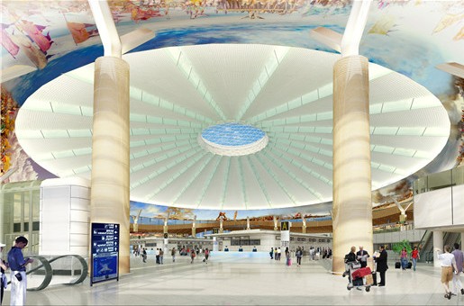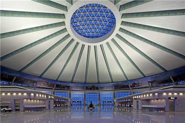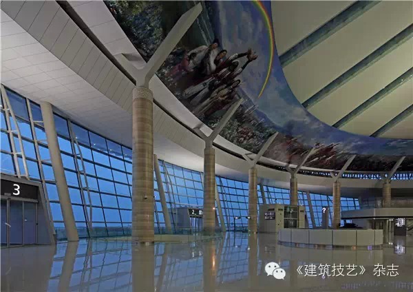 與建筑形象相呼應,一個108m直徑的空間由24組V型鋼柱支撐,宏大的屋頂漂浮于32m的高空,中心30m直徑的透空天窗與24根放射形鏤空結構梁一起塑造出對于太陽的崇拜和獨特的空間體驗。穹頂下部一幅長達300m的手繪油畫長卷,將按8個方位描繪草原天驕成吉思汗的一生,同時反映草原上的風土人情。天光云影將隨時間的推移游離于航站樓大廳的每個角落。歷史、傳說、藝術、象征,現代交通、現代建造理念與建造技術共同凝聚在一起,構成了鄂爾多斯最重要的門戶,演繹出“蒼天白云,大漠雄鷹”的主題。
