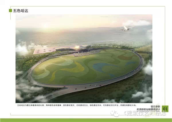 鄂爾多斯機場航站樓由中國建筑設計研究院(集團)中旭建筑設計研究院作為設計總承包,中國民航機場建設集團公司及加拿大B+H建筑師事務所等分包設計單位共同參與設計完成。新航站樓的外形曾取材于飛去來器和玉如意,也曾取材于升起的丘陵與地形,而最終一個來源于蒙古包的圖案放在了屋頂天窗上,被放大再放大,成為了控制性的主體。兩翼底部由地面升起,彎曲伸展,形成了形象獨特的候機廊。有人說這是草原上的一只白鷹,隱喻著大汗成吉思汗出生的傳說;有人說這是一個能飛的大帳篷,像宮崎駿筆下的夢想。不經意間,“草原雄鷹”成為了機場的宣傳詞被廣為流傳。