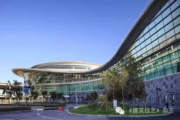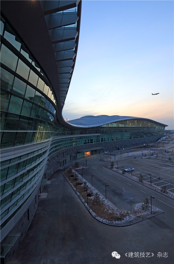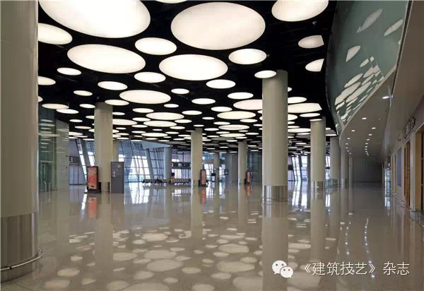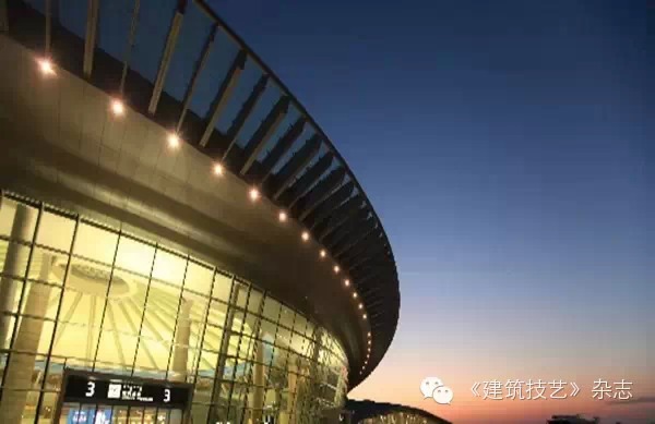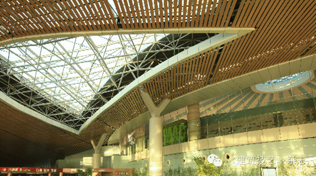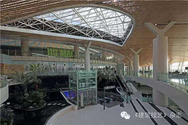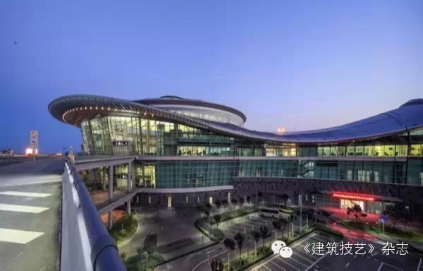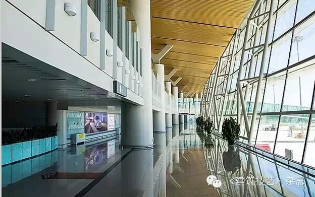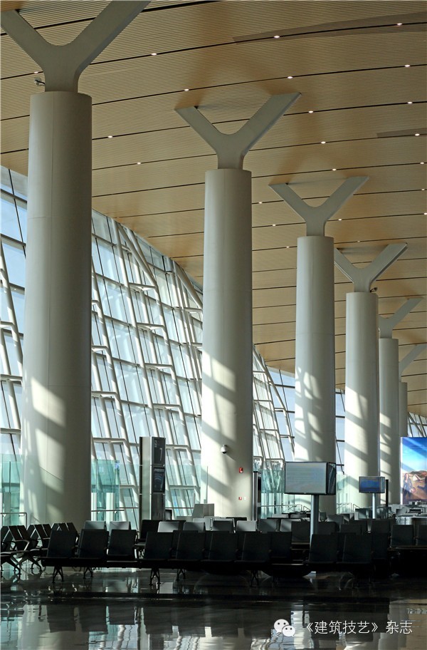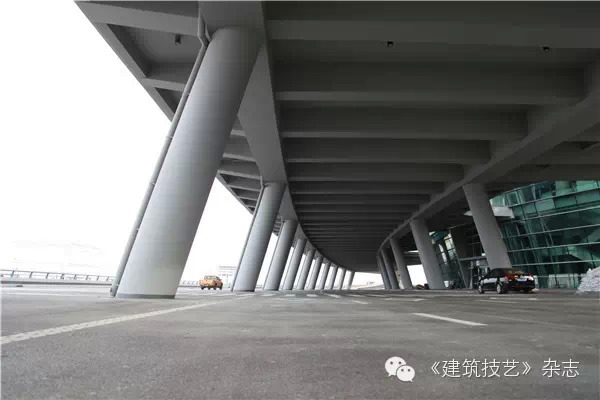 航站樓主體鋼骨柱與鋼結構屋蓋的連接采用Y型支撐。25米出挑的雨棚和主體采用鏈接式結合,取消了一排支撐柱子,成為單排支撐的雨棚。停車樓采用預應力空心樓蓋,預應力采用緩粘結和無粘結預應力技術。