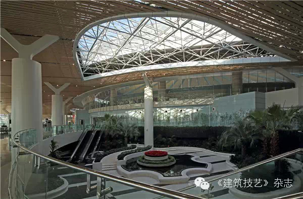 我們將綠色花園植入到航站樓中,在穹窿頂的兩側分別設置了一個被稱作“綠肺”的中庭,結合旅客進出港通道及候機等候區創造了兩個四季常綠的區域。這個陽光明媚的區域將帶給人們愉悅的心情和不期而遇的驚喜。候機廳內的小型綠化中庭結合周圍的咖啡廳、書店、兒童活動區、中轉區、VIP入口等服務設施,給候機旅客提供了更優質的服務——幫助消除旅行中的疲勞和等候中的焦慮,給旅客以全新的感受。